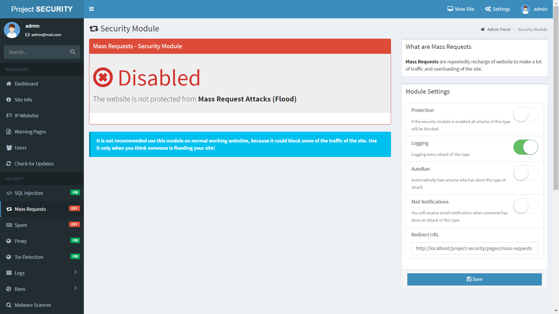 Project SECURITY is a powerful website security app that will protect your website from hackers, attacks and other threats. It could protect your website from SQLi Attacks (SQL Injection), Mass Requests (Flood / DDOS), XSS Vulnerabilities, Proxy Visitors, Spammers, Malicious Files (Shells) and many other types of threats.